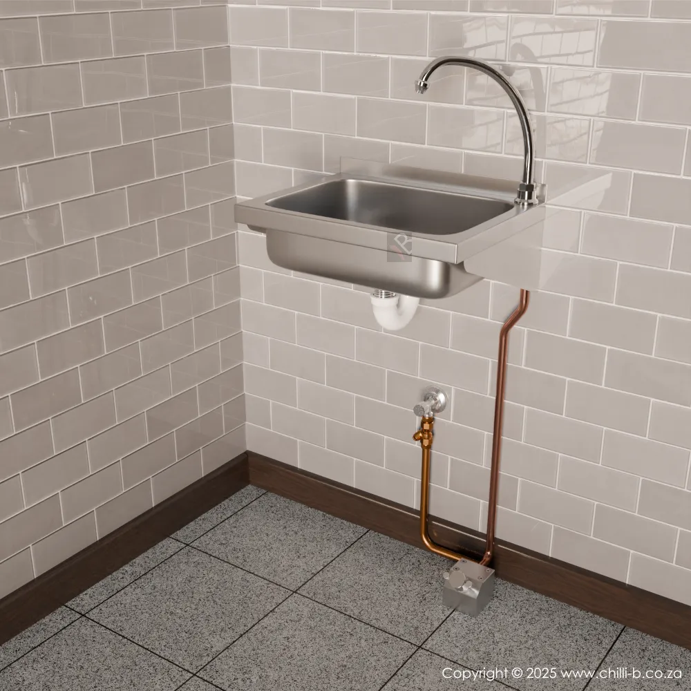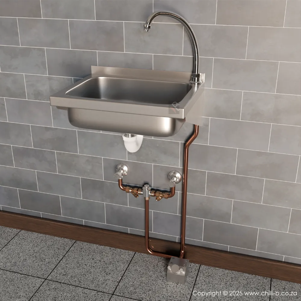 A complete setup for hands free washing, suitable for high traffic areas such as factories, food processing plants, laboratories, doctors rooms, clinics and more. Both these setups allow mechanical mixing of hot and cold water before it reaches the foot operated valve. The Boxed Foot Valve and the Calderoni foot valve do not mix hot and cold water. The samples bellow show a mechanical mixer but a thermostatic mixer can also be installed. A thermostatic mixer ensures that the temperature of the mixed water will never scald or burn the users hands.
