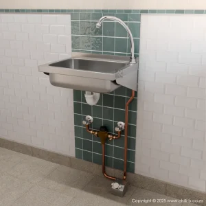 Heavy duty stainless steel hands-free washbasin with knee operated tap. We include the water spout, placed in the rear right-hand corner and a 32 mm waste outlet. Note: The metered valve and the pipework linking the water spout to the knee operated front panel is supplied with the washbasin. The valve does not mix hot and cold water, so the supply is cold water only. Using hot water requires either a mechanical mixing valve (CO-El-X60 or CB-THERM-15) or a thermostatic mixing valve (W-15/3). Wall-mounted by fitting a top joggle strip under the upstand return and by screw fixing through the integral rear brackets. Screws and plugs are not included. This basin is ideal for the food industry, hospitals, clinics and doctors surgery rooms.